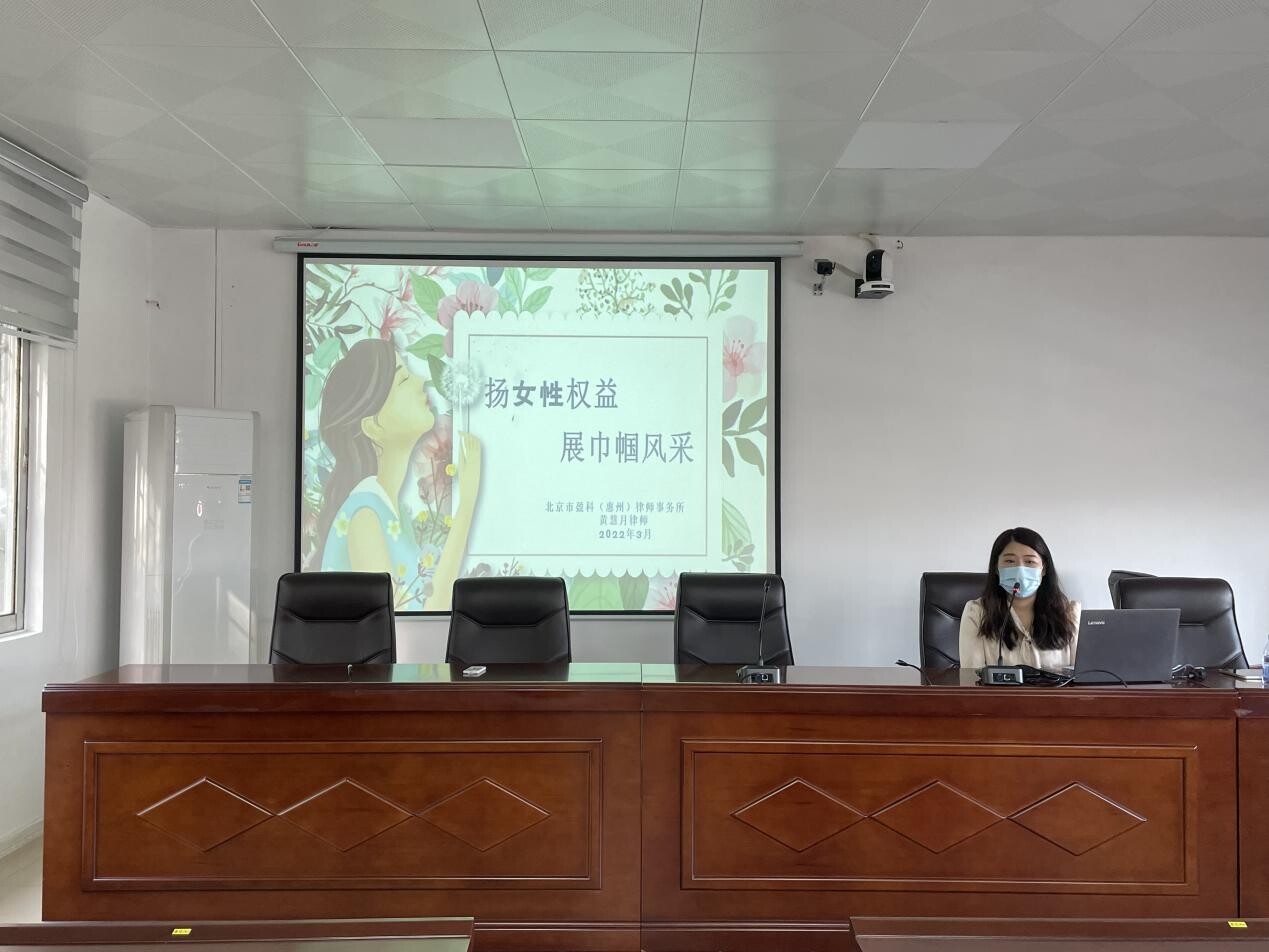 为进一步推进妇女法治宣传教育工作,我局还邀请了北京市盈科(惠州)律师事务所黄慧月律师为我局全体女干部职工开展“扬女性权益,展巾帼风采”妇女权益专题讲座。黄律师从职场权益、婚姻家庭权益、财产权益、人身权益等与女性密切相关的权益做了一番风趣生动的讲解。让一些艰深难明的条款条例通过实例解读后变得通俗易懂,也通过自己的所见所闻,对女性如何有效保护自己提出了暖心建议。