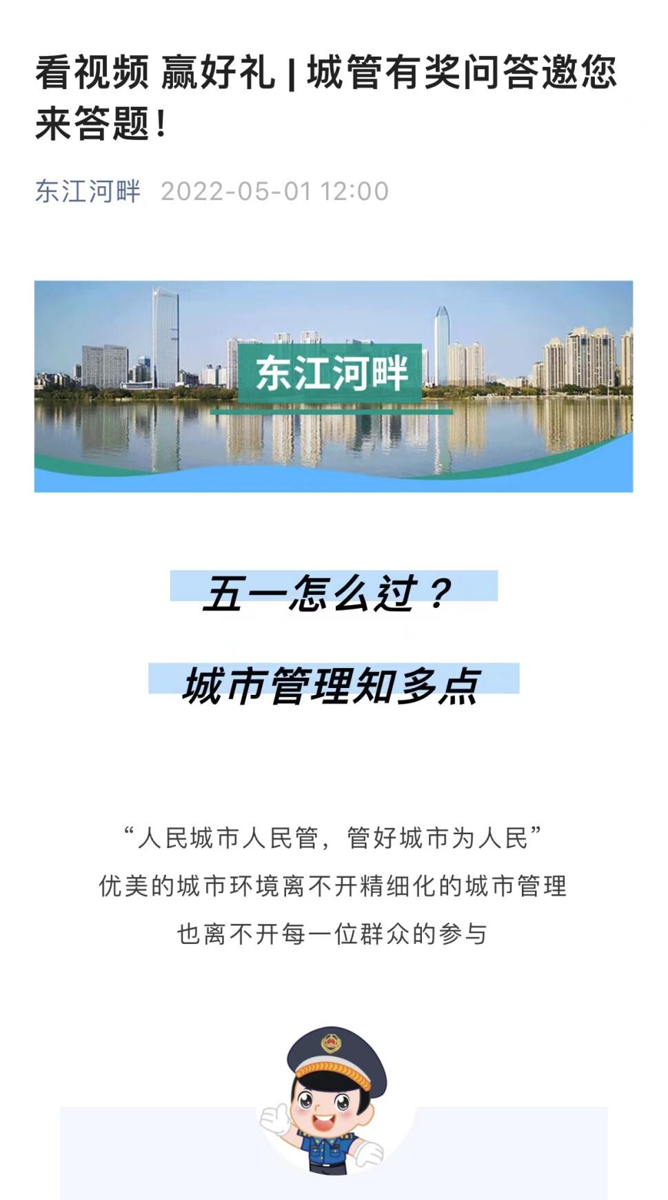 为提升广大市民对中文博彩平台城乡管理和综合执法工作得知晓度、支持度、参与度,强化普法宣传,中文博彩平台城乡管理和综合执法局紧紧围绕“八五”普法规划和2022年县城管执法领域法治宣传教育工作部署,在“东江河畔”微信公众平台推出“看视频 赢好礼”的动画普法有奖竞答活动,活动于5月1日至5月5日进行,共计5天。