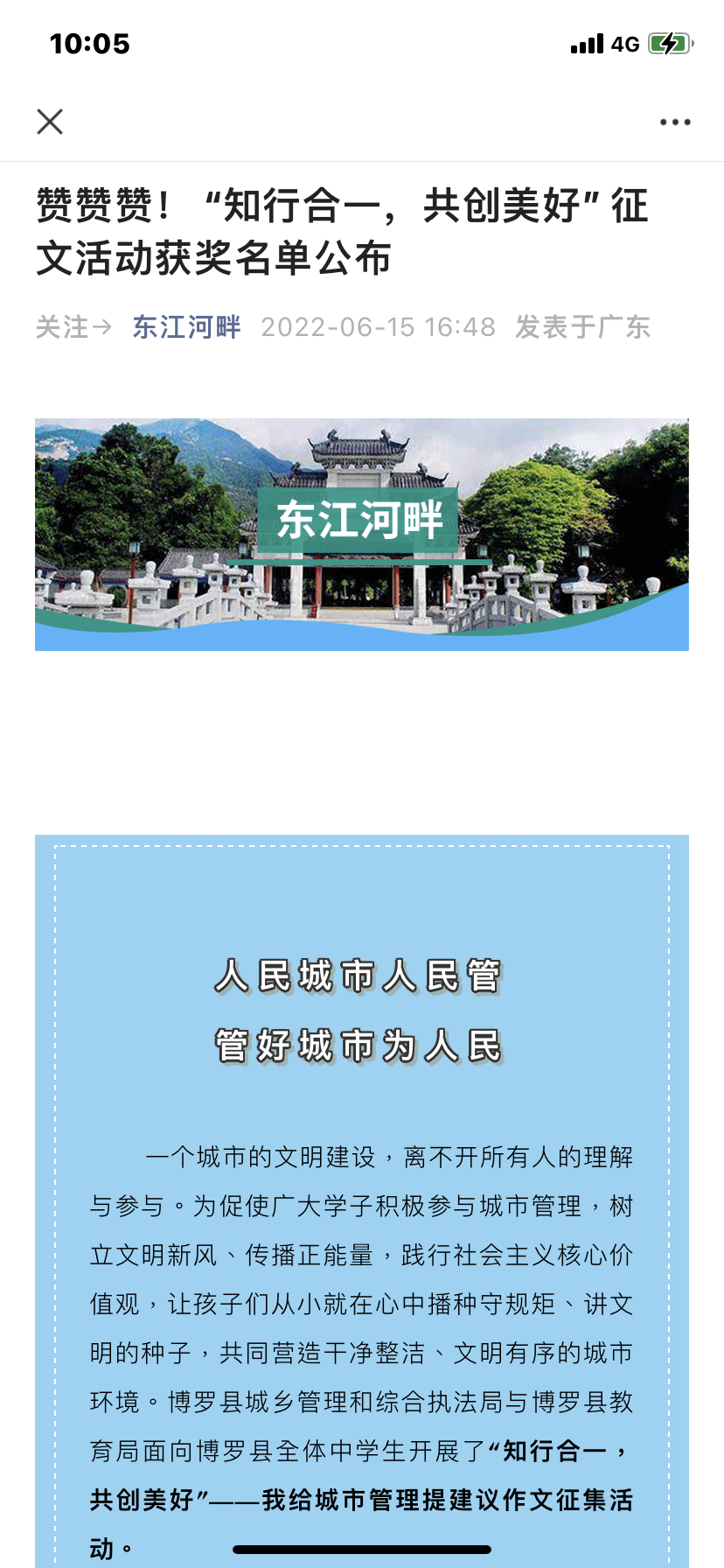 目前,本次征文比赛活动已圆满结束,活动结果在“东江河畔”微信公众平台公布。网址://mp.weixin.qq.com/s/VdyFiJCKjIuWXZOEi4VbmA。本次比赛共征集作品168份,其中评选出一等奖5名,二等奖10名,三等奖15名以及优秀奖30名。大多数征文能结合我县城市管理工作现状和实际,对重点、难点问题的破解以及为城管工作的改革创新,提出了不少有建设性的意见建议,对今后促进我县城市管理工作提质升级提供了一些良好的思路。