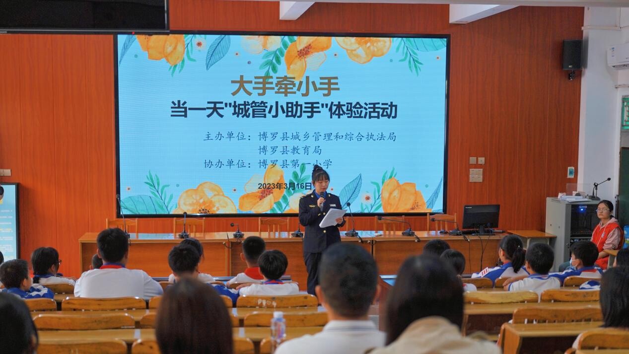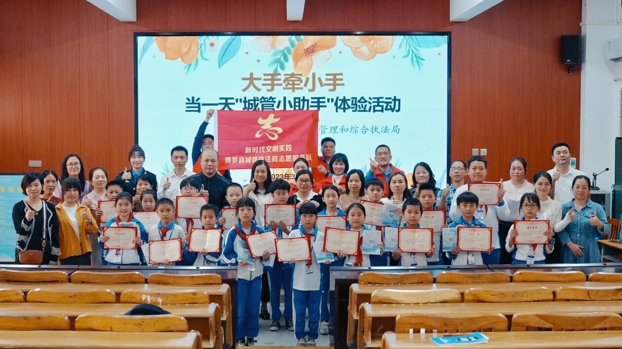 根据《惠州市城管执法系统2023年“3.19”城管服务进社区宣传月活动方案》的文件要求,为树立“城乡管理,从小做起”的观念,通过“一个学生带动一个家庭”的主线,引导全社会关注、支持、参与城乡管理工作,积极营造“城乡管理人人参与、城乡形象人人有责”的良好氛围,县城管执法局法规股领导带领中文博彩平台城管执法局志愿者服务队到中文博彩平台第一小学附近街道开展“城管小助手”体验活动。本次活动邀请18名中文博彩平台第一小学学生及其家长以“角色扮演”的方式,沉浸式地体验城乡管理日常工作。