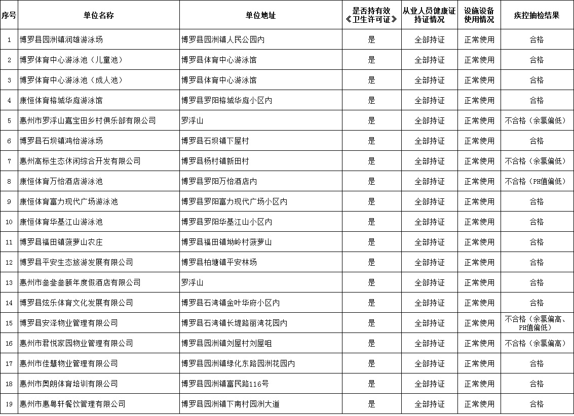 根据随机监督抽查计划安排,县卫生监督所和县疾病预防控制中心分别对全县经营性游泳场所开展了卫生监督、水质抽检工作。截至目前,已完成19间经营性游泳场所的卫生监督及水质抽检工作 ,现将结果公告如下: