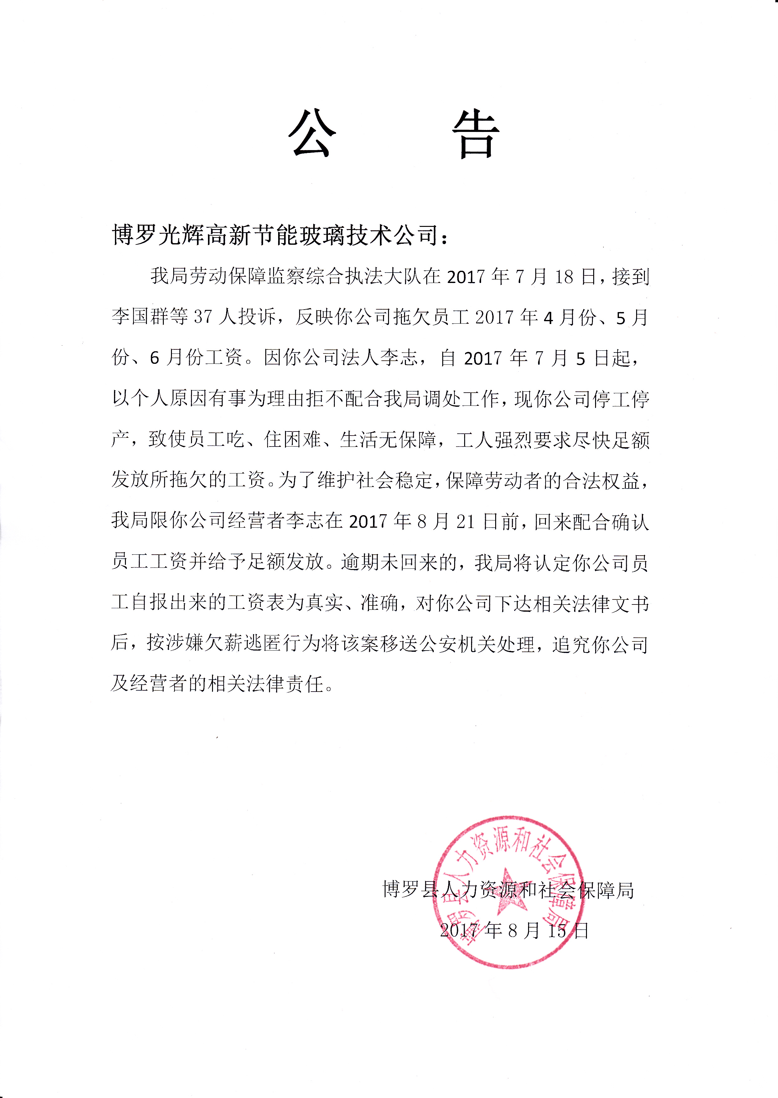 通知用人单位配合处理欠薪案件的公告(中文博彩平台光辉高新节能玻璃技术公司)