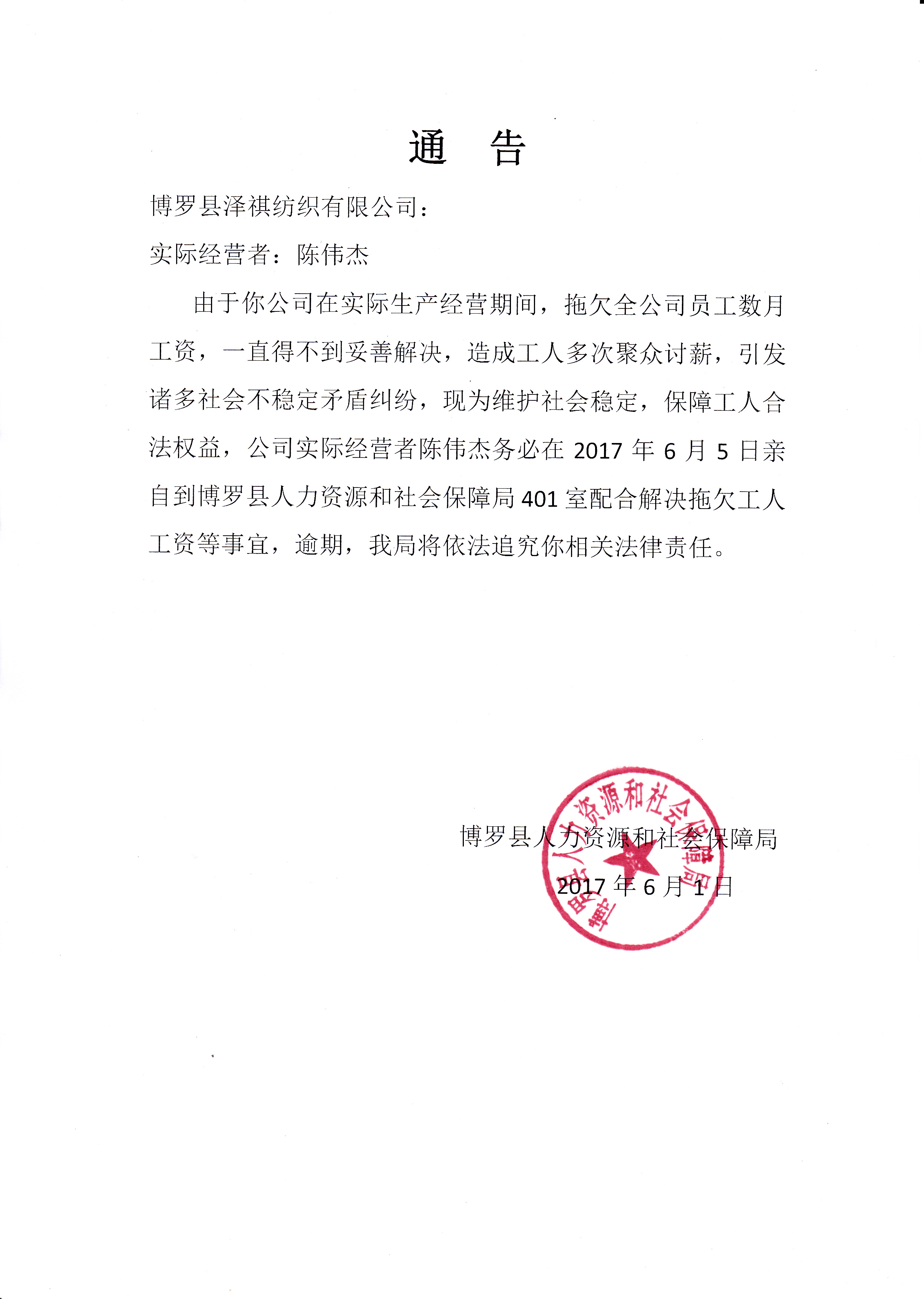 通知用人单位配合处理欠薪案件的通告(中文博彩平台泽祺纺织有限公司)