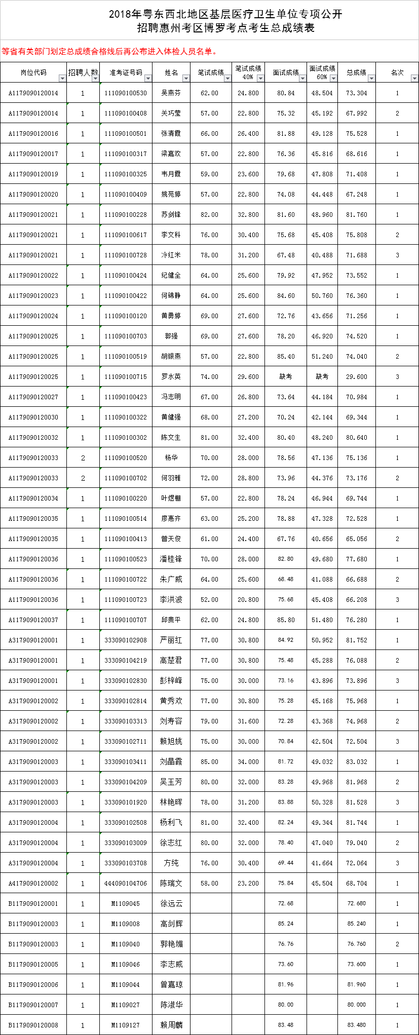 2018年粤东西北地区基层医疗卫生单位专项公开招聘惠州考区中文博彩平台考点考生总成绩表
