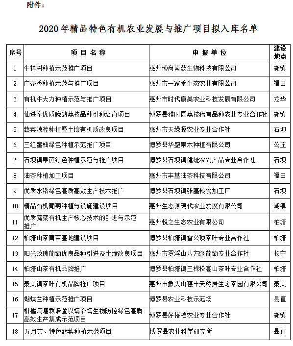 附件:2020年度精品特色有机农业发展与推广项目拟入库名单