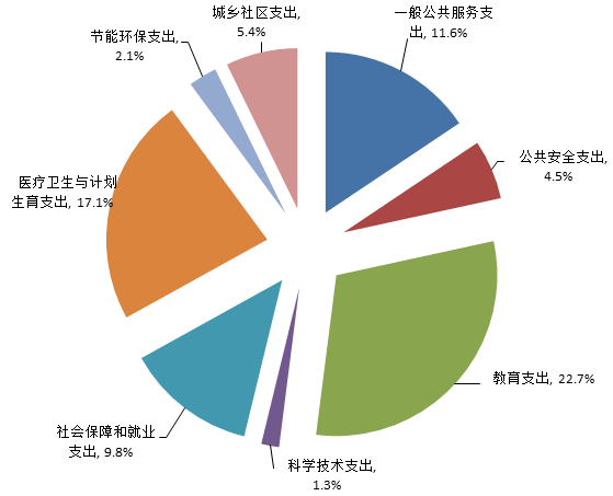 全年公共财政预算支出76.98亿元,增长4.1%。其中教育支出17.48亿元,增长4.4%,占公共财政预算支出的22.7%(见图2)。