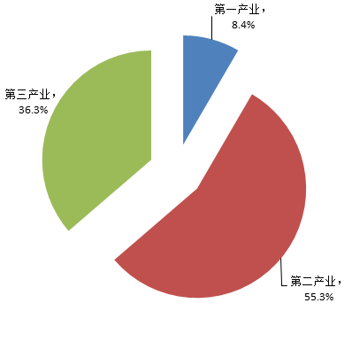 据市统计局核定,2016年全县地区生产总值(GDP)613.62亿元,按可比价格计算,比上年增长(以下简称增长)11.9%。其中,第一、第二、第三产业增加值分别增长2.9%、16.7%和6.9%,三次产业结构为8.4:55.3:36.3(见图1)。人均GDP57364元,增长11.4%。