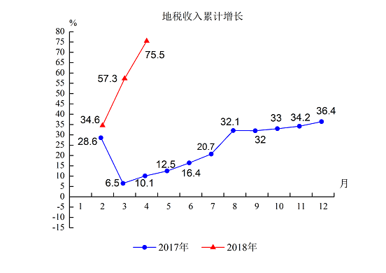 1-4月,全县完成税收收入29.68亿元,增长36.6%,与1-3月相比,增幅提高1.1个百分点。其中,国税收入完成18.98亿元,增长21.4%。国税收入的增长主要源于国内增值税的增长,1-4月国内增值税增长20.2%,占国内税收的比重76.2%。地税收入完成10.7亿元,增长75.5%,与1-3月相比,增幅提高18.2个百分点。地税收入的增长主要源于企业所得税和个人所得税的大幅增长,以上两税收入合计1-4月增长159.7%。