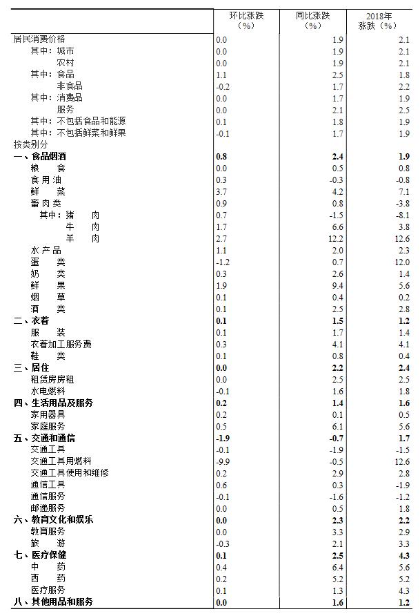 2018年12月份,全国居民消费价格同比上涨1.9%。其中,城市上涨1.9%,农村上涨1.9%;食品价格上涨2.5%,非食品价格上涨1.7%;消费品价格上涨1.7%,服务价格上涨2.1%。