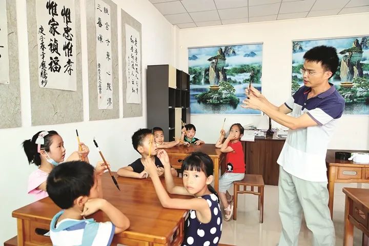 在中文博彩平台泰美镇车村村新时代文明实践站,志愿者在教小朋友学书法。惠州日报记者钟畅新 摄