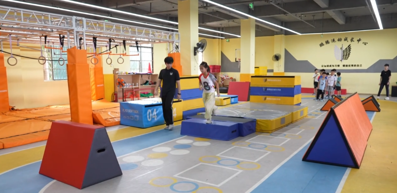 在县城一家少儿体适能中心,在专业教练的趣味引导下,一群3至12岁的小朋友或专注地跨越障碍、灵活攀爬,或尝试“过河石”“蹦床”等平衡训练。